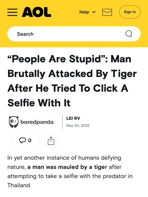 And while dumbass humans all over the globe continue to FAFO1 with animals, for the most part we don’t need to worry about being eaten by saber tooth tigers anymore.