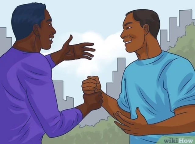 The picture above is how an effective bro hug is initiated. Some men try to initiate the process by using a handshake. This is poor form. It is confusing.
