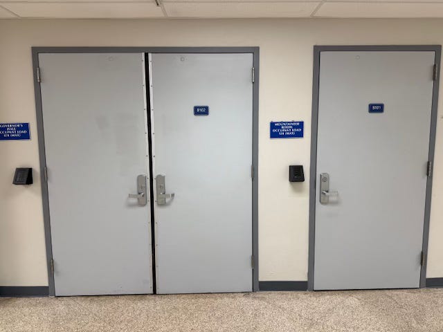 The relatively nondescript room entrances below would’ve housed sessions of the House of Representatives (on the left) and the Senate (on the right). Note the capacities for each room (474 on the left / 124 on the right). This area was another that was hidden in plain sight, meaning civilians would’ve passed it occasionally. The builders of the bunker purposely made the seating capacity slightly larger than needed in an effort to conceal its actual purpose.