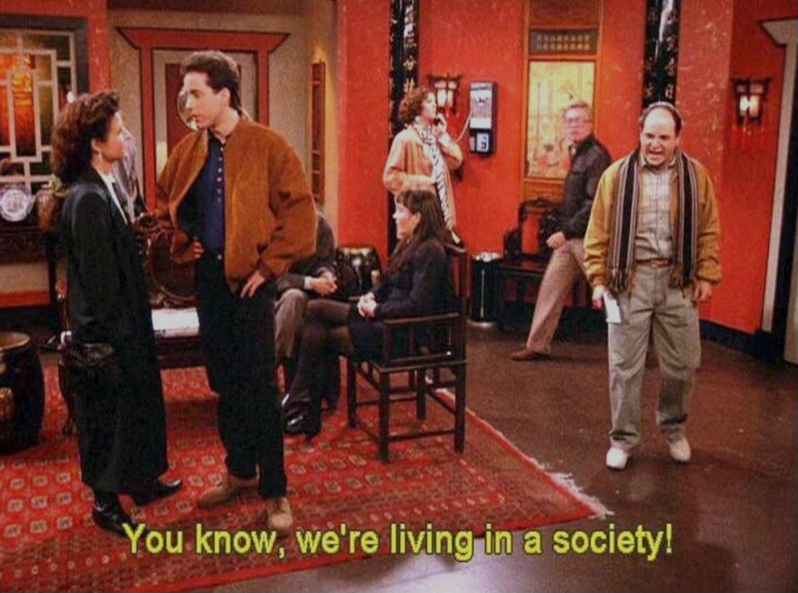 But I have to say, in recent months and years, I have seen a significant uptick in my ‘society’ moments. Moments where I want to scream out loud to anyone that can hear, “We’re living in a society!”