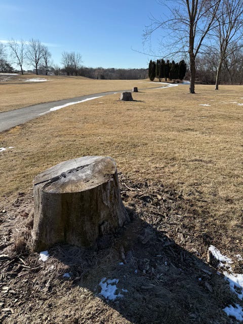 Tree stumps litter both the land that has not yet been fully developed and the existing course. Like many areas in the Midwest the past ten years or so have been devastating to our local trees. Bugs like the Emerald Ash Borer have left many beautiful trees to rot.