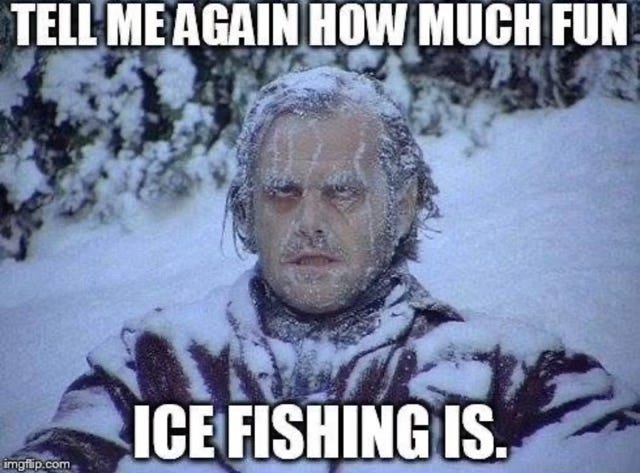Ice fishing is ONLY fun after adding alcohol. Anything that requires drinking to become fun is prob best left low on the to-do list. Like, a line above washing duvet covers.