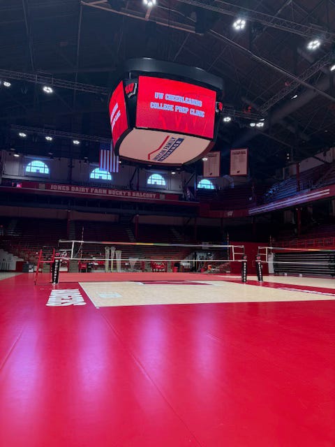 Last weekend, I accompanied my wife and daughter on another college cheer visit. This time to the University of Wisconsin. Located in Madison, this idyllic setting is mostly ruined by the constant assault on your eyes by the color red. Any of my Ithaca friends will understand how gross this picture is: