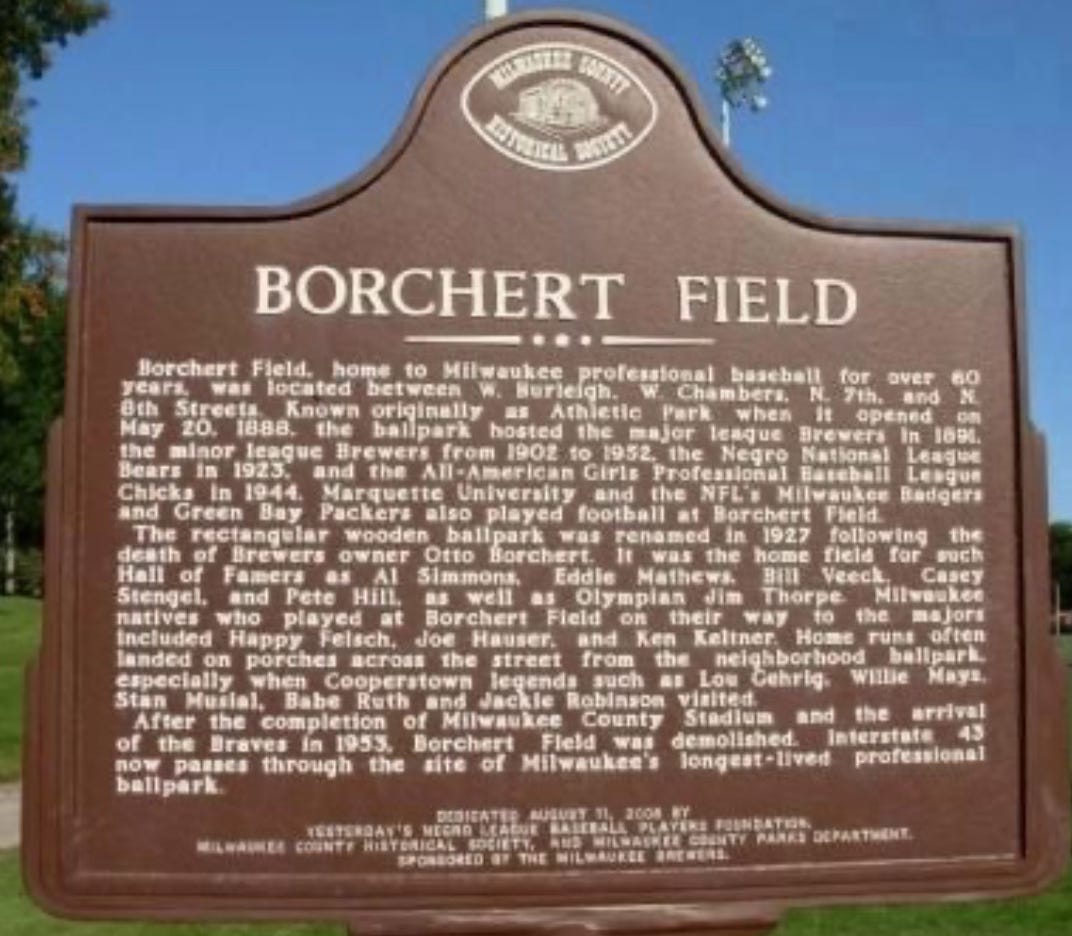 Earlier this week, I had to abort what had been a Herculian effort on my part to locate the historical marker for Borchert Field. After about 30 minutes driving around a north Milwaukee community that more resembled Gaza than the former home of a ballpark, I found the sign.