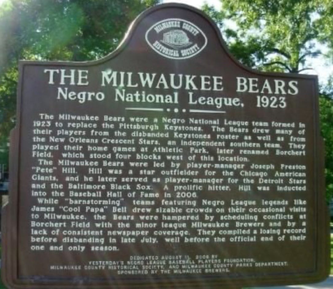 The Milwaukee Bears were a Negro National League team formed in 1923 to replace the Pittsburgh Keystones. The Bears drew many of their players from the disbanded Keystones roster as well as from the New Orleans Crescent Stars, an independent southern team. They played their home games at Athletic Park, later renamed Borchert Field, which stood four blocks from this location.
