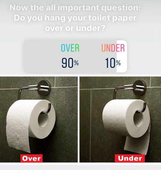 Over the top and in the front. We are back to toilet paper somehow. Nonetheless, there is a right and wrong way to do everything. The toilet paper roll is no exception. Over the top and in the front! It’s a scientific fact.