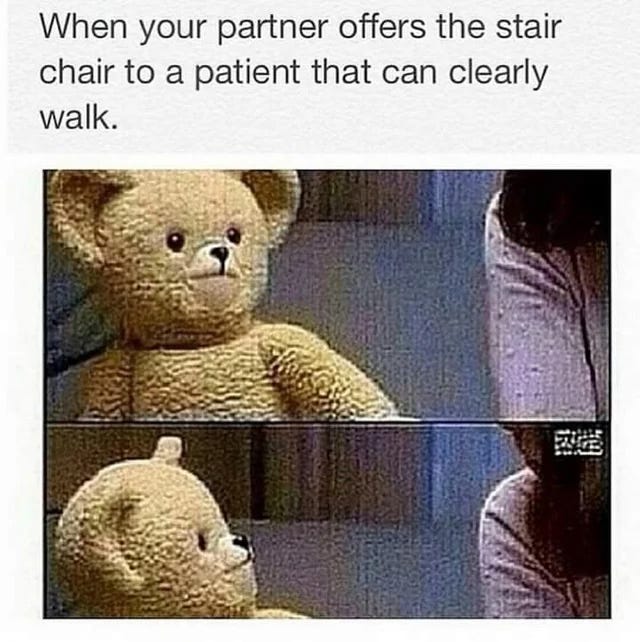 Walk to the ambulance if you can. This is just a free life tip. I am a paramedic, and I promise you, no credibility of your complaint is lost if you can walk to the rig. But if I have to lug a cot to a second-story floor for elbow pain… there are memes about you kind of people.