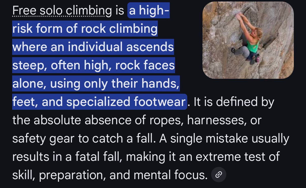 Or in twenty years, when humanity has elevated itself, and people have realized that doing stupid shit that can kill you only masks some deep-seated self-loathing or trauma, and things like free-solo-ing have gone the way of the flying wedge, I could say, “I knew it!”