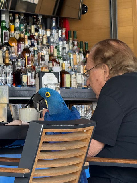 Saw some interesting people. Like this man, eating lunch with his pet parakeet: